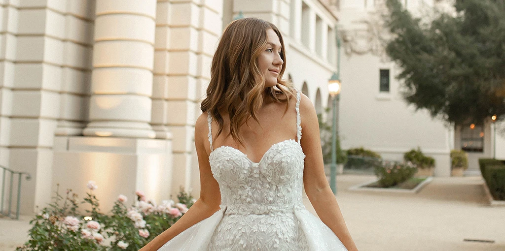 Lace is traditionally related to bridal elegance. Its intricate patterns and delicate textures bring an air of timeless romance to any gown. Whether used as an overlay or incorporated into sleeves and necklines, lace adds detail without overwhelming the dress. Its beauty lies in its versatility. Chantilly lace’s intricate design gives it a classic appeal. On the other hand, Alencon lace—a heavier, corded version—offers a more pronounced texture, ideal for more structured gowns.